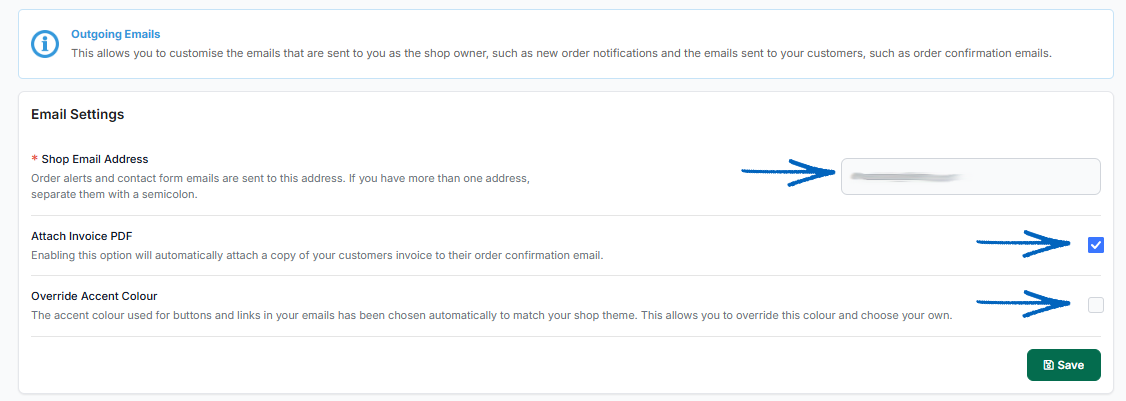 Here, you need to add an email address which matches your domain name- such as sales@[yourdomainname] or similar. This ensures customers receive emails from your shop sent from the correct address.