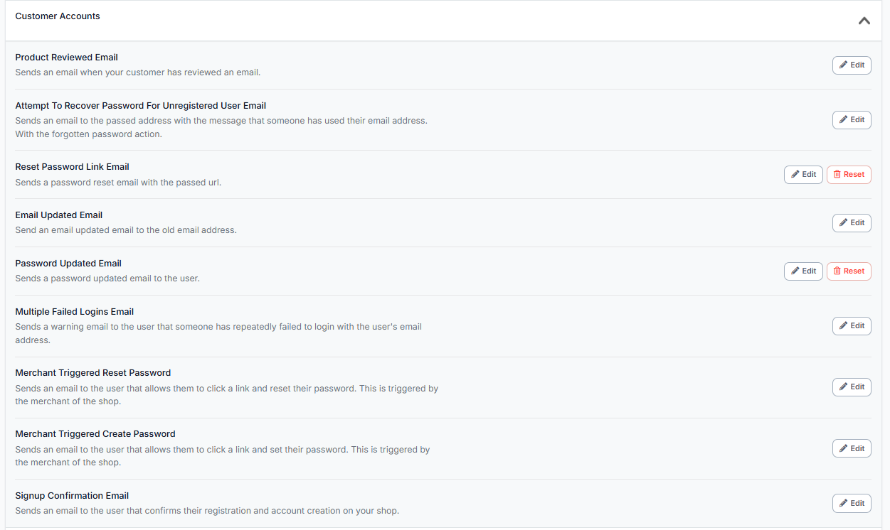 If you have installed the Customer Login feature on your EKM online shop to allow customers to make accounts, save Products to a Wish List and earn Loyalty Points, this is the area where you can edit all of the emails a customer could potentially receive from your EKM online shop:
