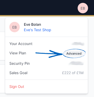 1. You can see what tier your EKM online shop is on from the Dashboard by clicking on the circle in the top right-hand corner: