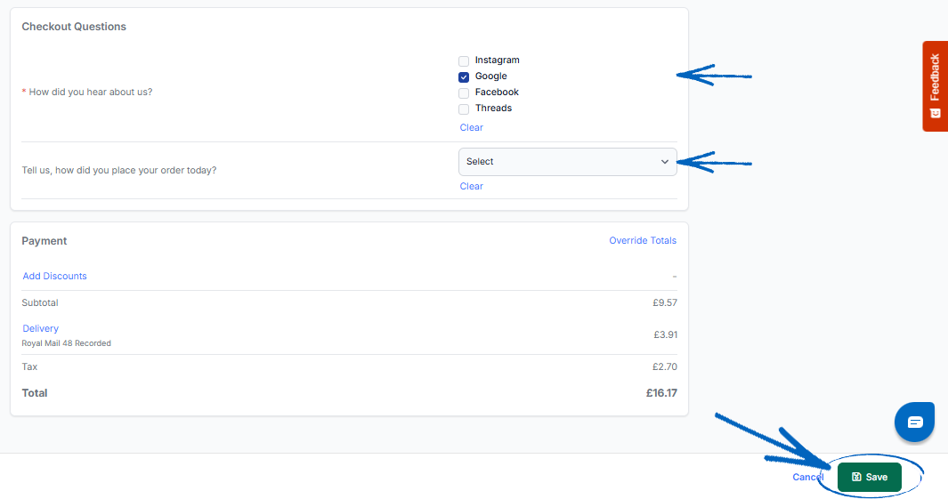 20. You are then redirected to a page where you can edit all of the elements of the order contents. In the Checkout Questions area, you can amend the response that was given on the Checkout Flow before clicking the green Save button in the bottom right-hand corner to save your changes: