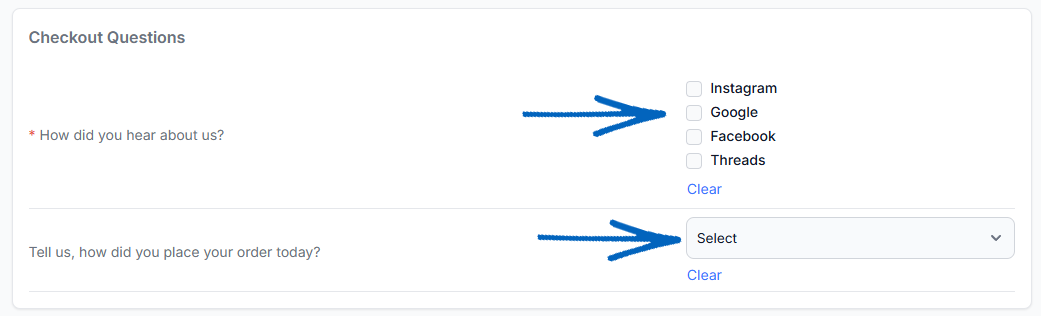 7. If you have any Checkout Questions set up on your checkout flow, scroll up to provide the answers for these on your customers’ behalf: