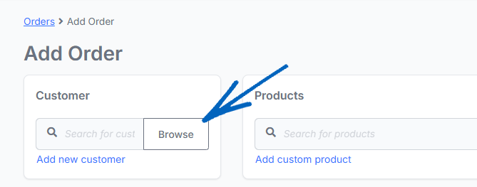 3. The left-hand side element will be populated when you have located your customer’s details. Your next step is to add products to the order. You can do this by using the Product search bar or clicking the Browse button to find items that way: