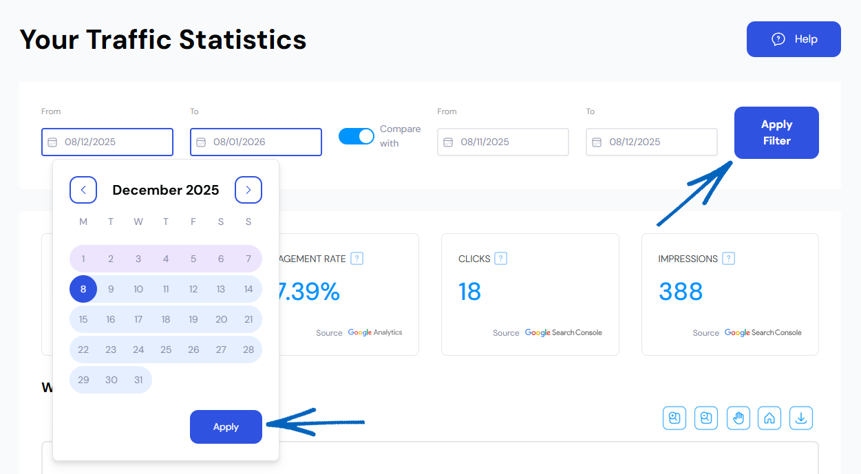 3. You’ll then see a second set of calendar fields appear. Click these to amend the dates for your comparison, click Apply on each Calendar before clicking Apply Filter on the right-hand side: