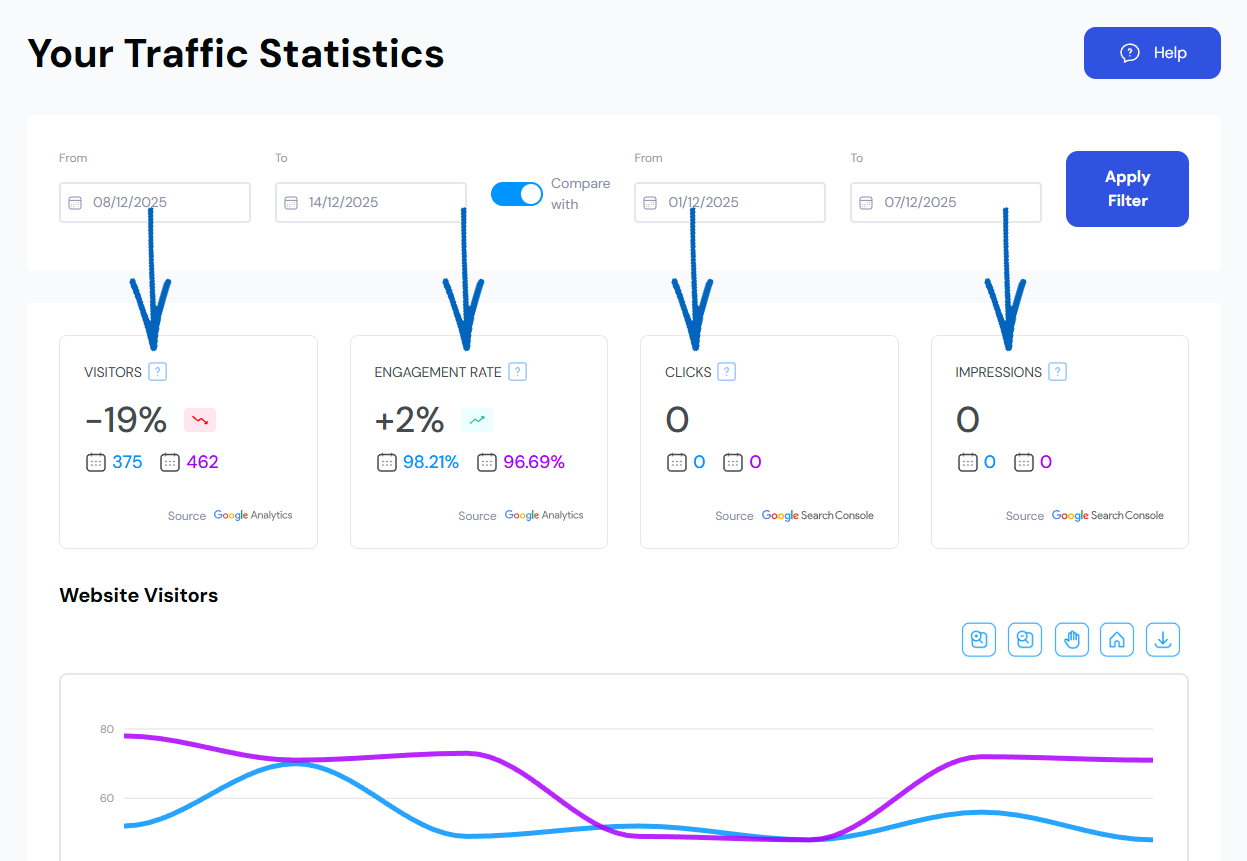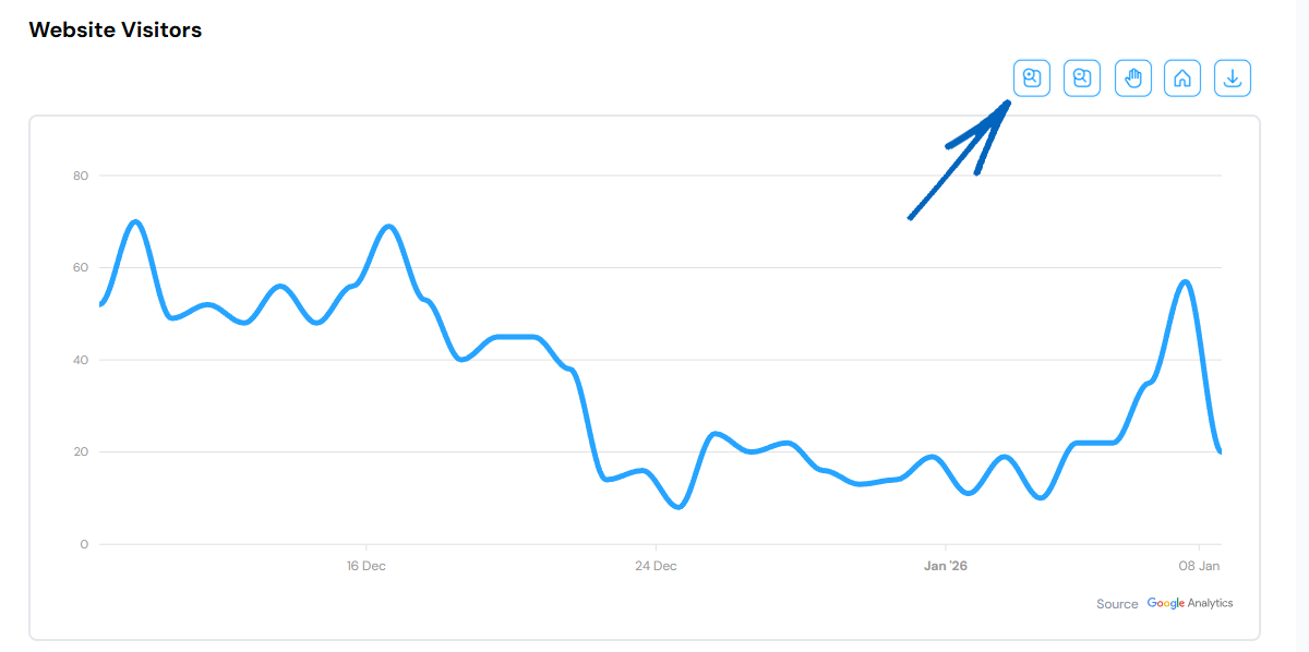 6. Below Website Visitors, you’ll find a graph displaying your Clicks and Impressions. Use the buttons in the right-hand corner to pan, zoom in and zoom out. You can also reset the graph and download the data here: