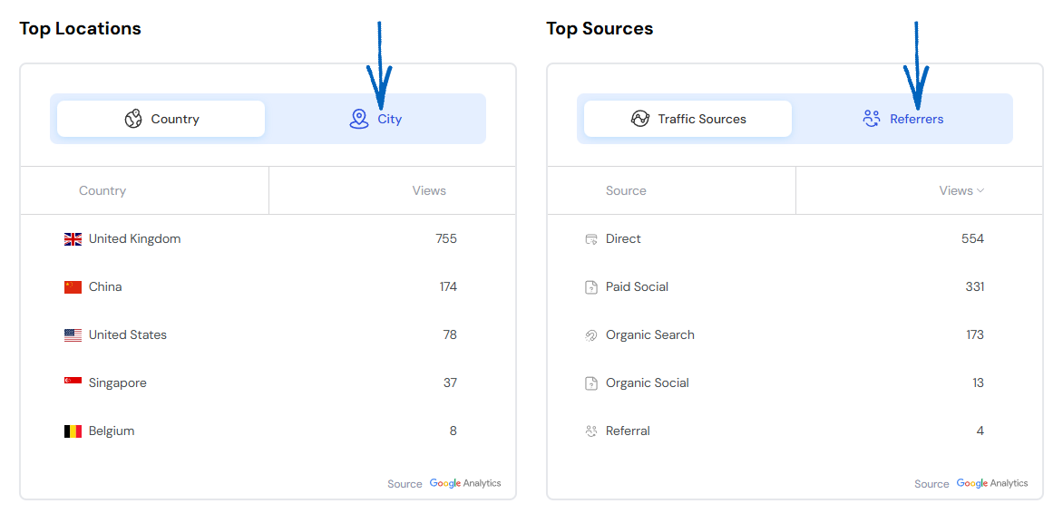 7. Further down the page, you’ll find elements dedicated to the Top Locations and Top Sources of your traffic. They will display Country and Traffic Sources by default, but it is worth clicking City and Referrers too: