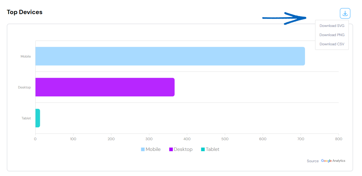 8. Finally, at the foot of the page, you’ll see a graph displaying the devices used by visitors to your EKM online shop. You can download this data by clicking the button in the top right-hand corner and selecting the file type from the drop-down menu:
