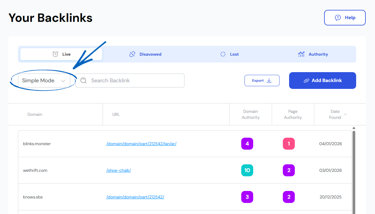 2. This page of the EKM SEO platform provides a breakdown of your backlink data. On the top left-hand side, you can click the drop-down button to amend the view from Simple Mode to Advanced Mode: