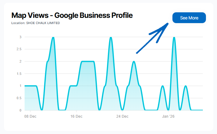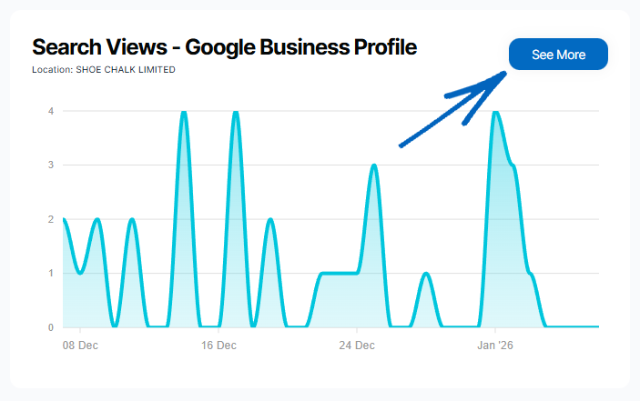 Here, you can see a summary of your Google Business Profile, listing search views, map views, website visits and phone calls made from your profile. You can also filter this data to compare different periods of time.