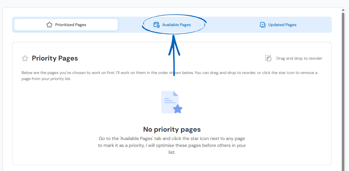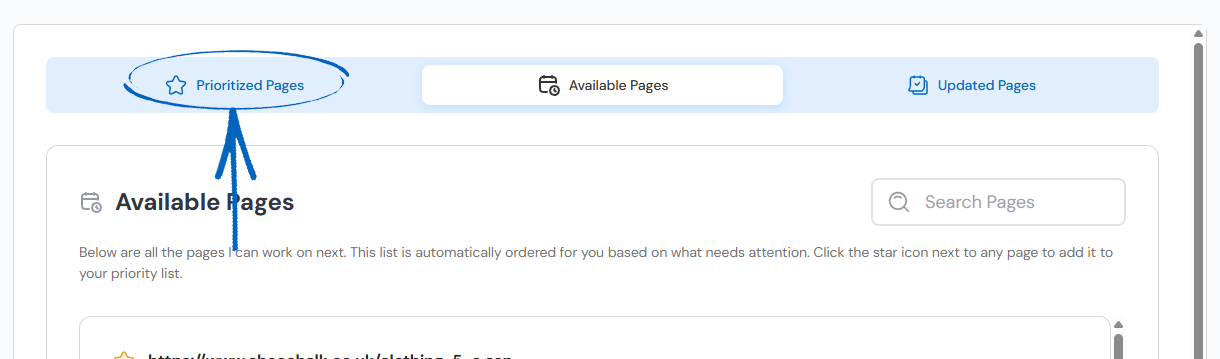 4. When you have finished selecting your pages, scroll to the top of the page and click the Prioritised Pages tab: