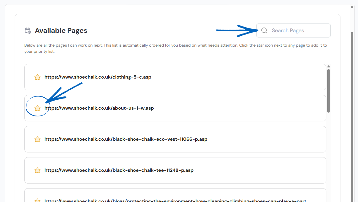 3. You’ll then see a list of page URLs from different pages of your EKM online shop. These can be webpages, product pages, category pages or blog posts. These pages will be listed in order based on which Seb AI thinks requires the most attention. Click the star next to any pages you would like Seb to work on first, or use the search field in the top right-hand corner to locate a specific URL: