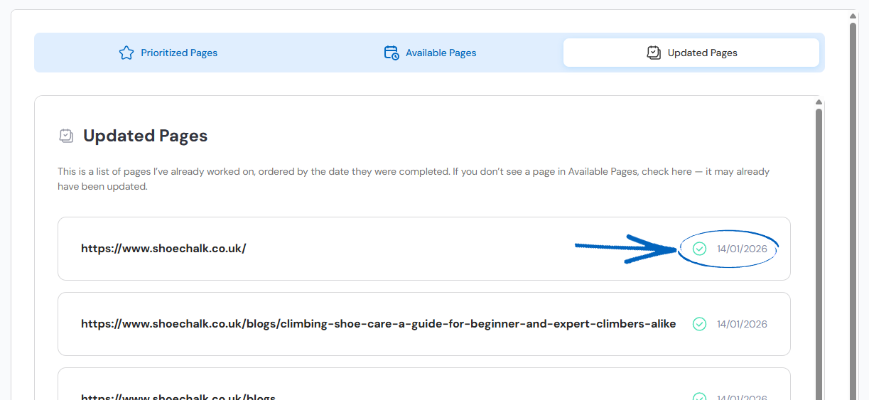 6. Updated Pages highlights pages where Seb AI has detected changes and worked on their SEO. Scroll to the top of the page and click the Updated Pages tab: