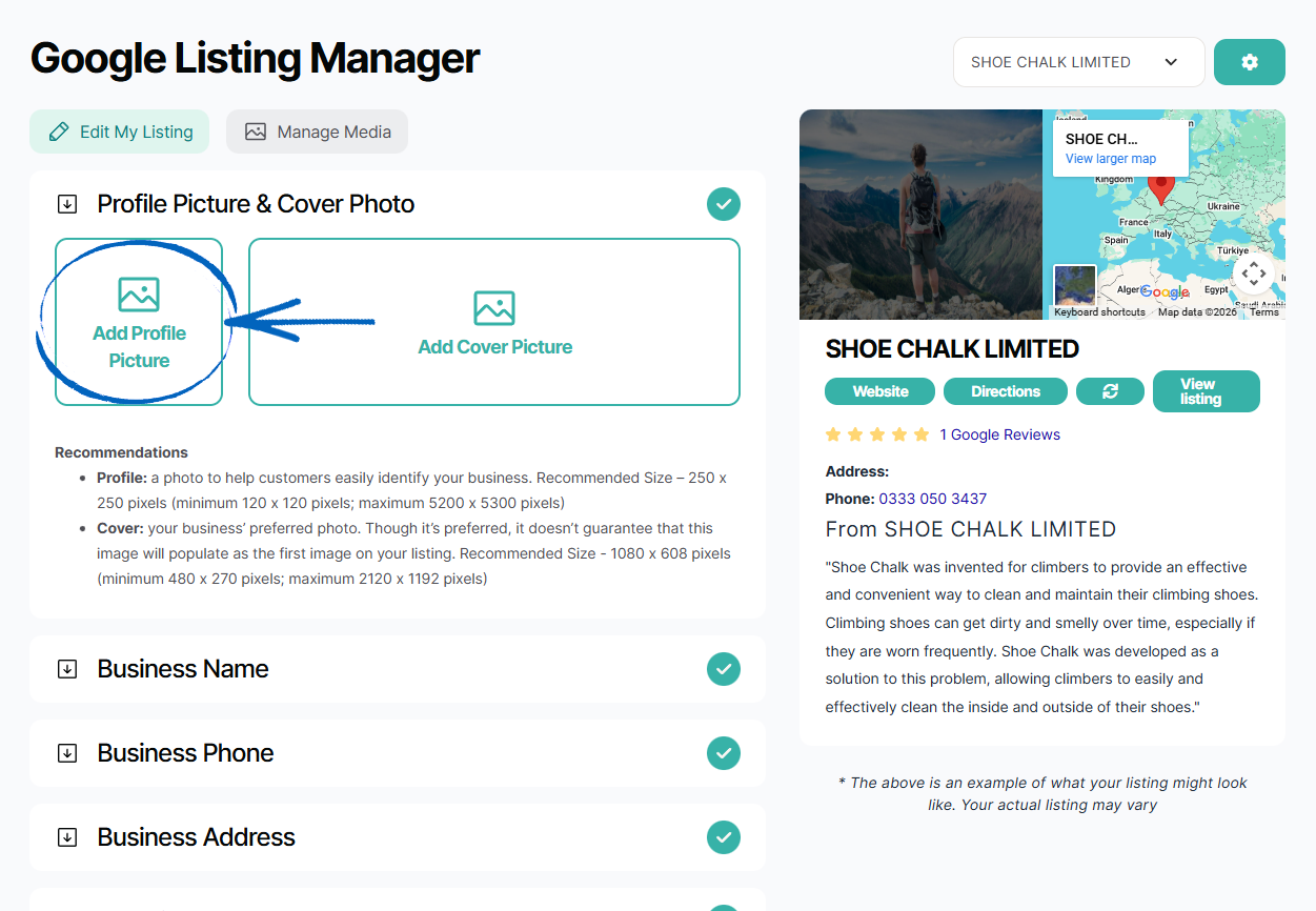 2. On this page, you’ll see a summary of your existing Google Business Profile. Listed on this page are all your details taken from that profile, with any issues highlighted. In this case, the Google Business Profile is missing a Profile Picture and Cover Picture. Click Profile Picture: