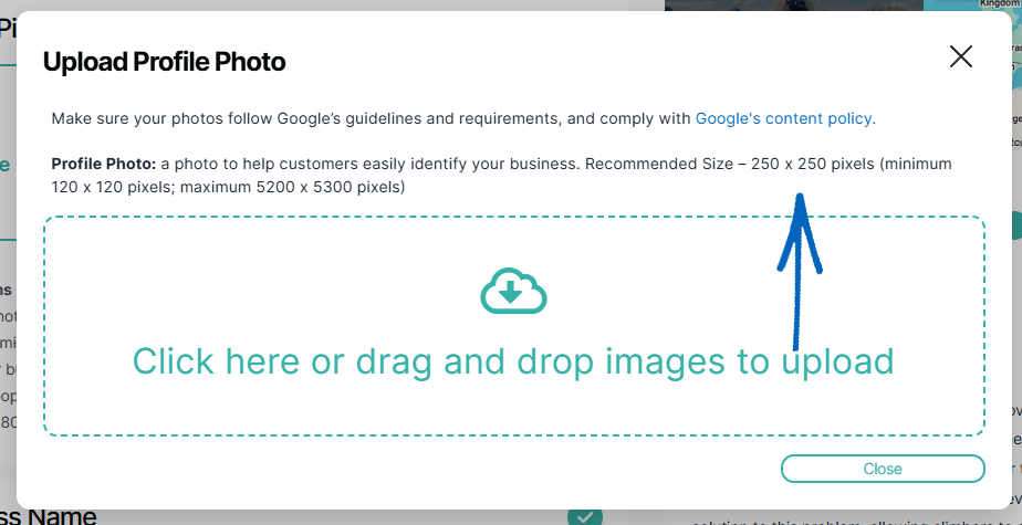 3. You’ll then see this modal appear. Drag and drop the image from your computer, ensuring that the image is correctly sized using the dimensions listed: