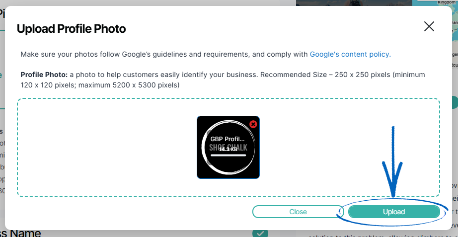4. When you have added your image to the modal, click the green Upload button in the bottom right-hand corner: