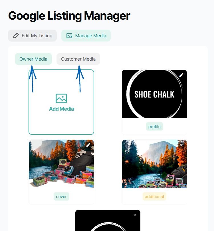12. This is where you’ll see Profile and Cover Pictures for your Google Business Profile, along with any photos or videos added by customers to their reviews. You can flip between Owner Media and Customer Media to differentiate between the two: