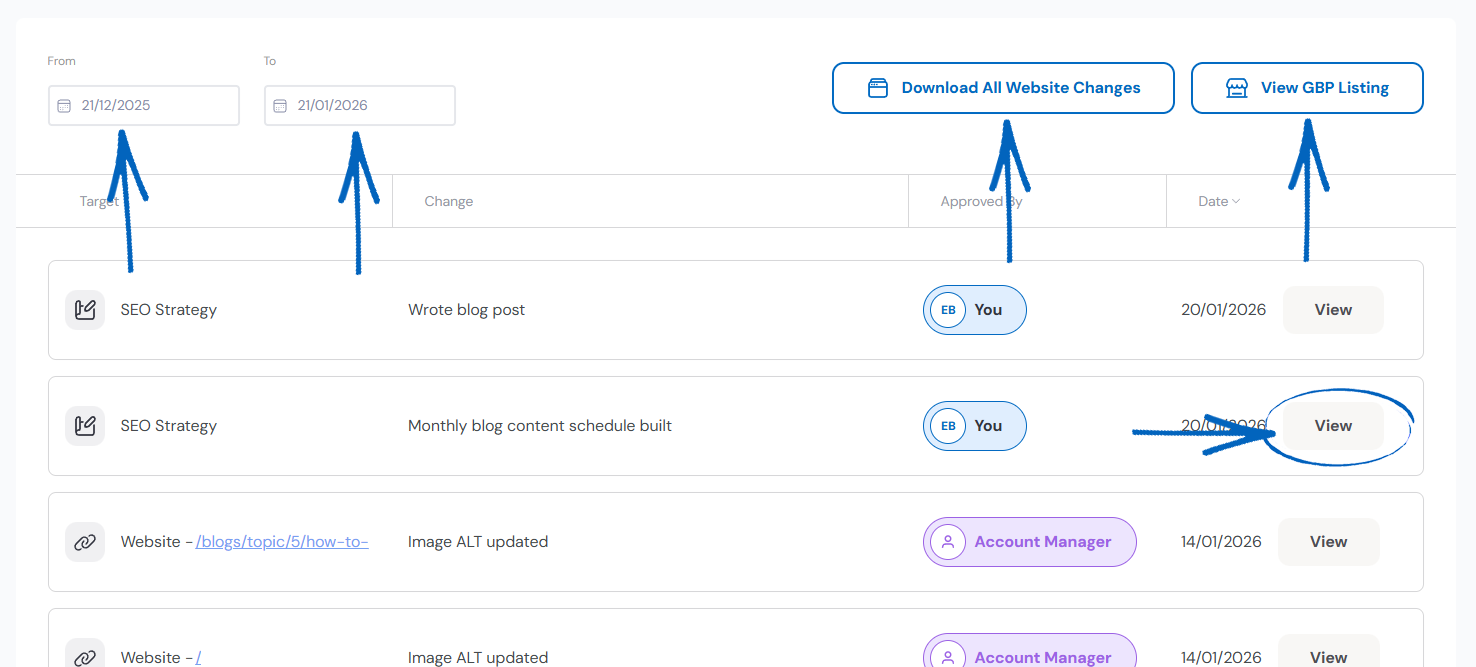 2. On this page, you’ll see a list of all the tasks Seb AI has completed. On the left-hand side, you can click in the From and To fields to amend the dates to see when tasks were completed during a specific period. On the right-hand side, you can click to download a CSV file of the completed tasks and view your Google Business Profile Listing. Click View on a completed action: