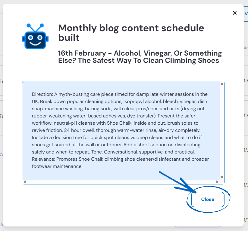 3. A modal will then appear, providing details of that action. You can scroll through the details and click Close when you’re done: