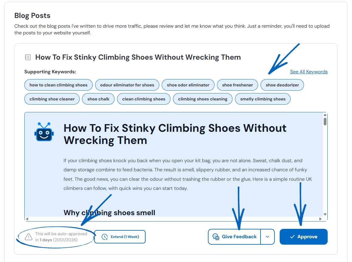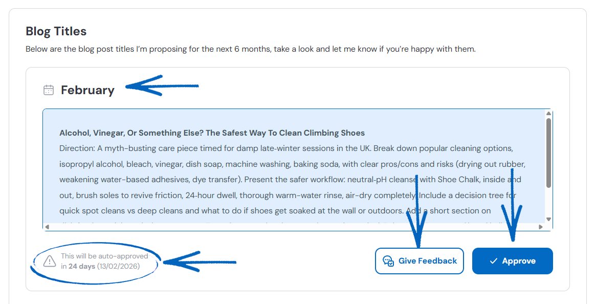 4. On this page, you’ll see a list of Blog Titles that Seb AI is proposing for your blog. Each title will be sorted into a month, and on the bottom left-hand side of each, you’ll see a notification for auto-approval and when this will occur if you have not actioned it beforehand. You’ll also see two buttons in the bottom right-hand corner. Click Give Feedback if you are not happy with the suggestion and wish to amend it in some way, or click Approve. If you click Approve, copy the text to your Notepad file so you can create a blog post based on the suggested Blog Title: