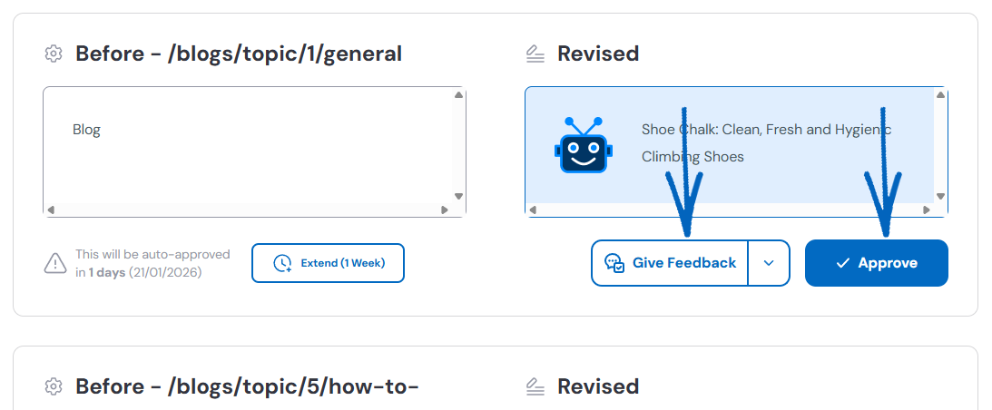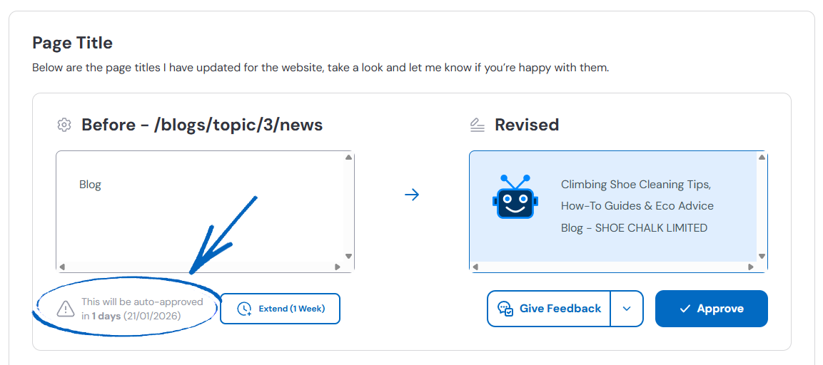 20. On this page, you’ll see a list of page titles that Seb AI has suggested. On the bottom left-hand side of each suggestion, you’ll see a notification for auto-approval and when this will occur if you have not actioned it beforehand: