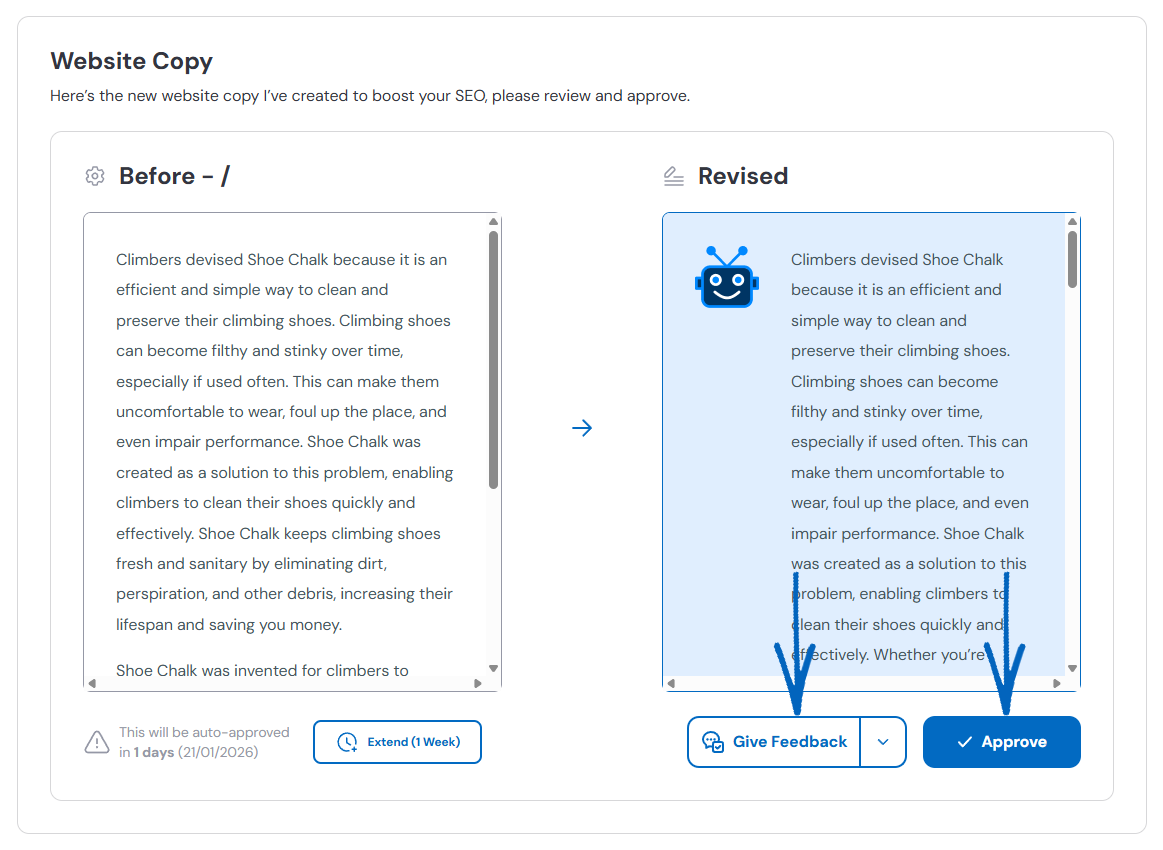 You’ll see two buttons in the bottom right-hand corner. Click Give Feedback if you are not happy with the text and wish to amend it in some way, or click Approve. If you click Approve, copy the text to your Notepad file so you can amend the text on your EKM online shop based on the suggestion: