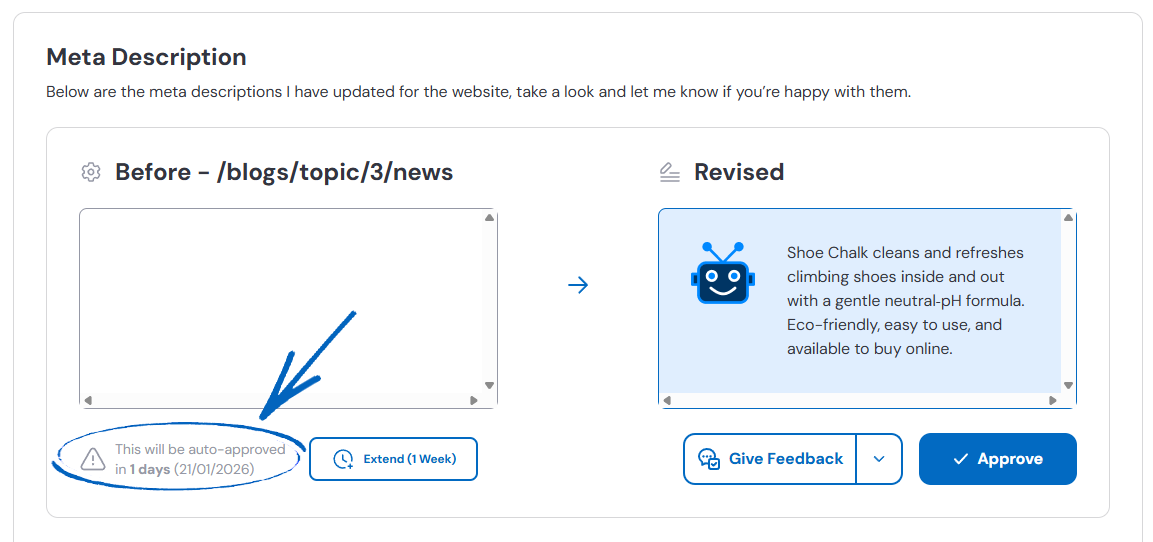 17. On this page, you’ll see a list of meta descriptions that Seb AI has suggested. On the bottom left-hand side of each suggestion, you’ll see a notification for auto-approval and when this will occur if you have not actioned it beforehand: