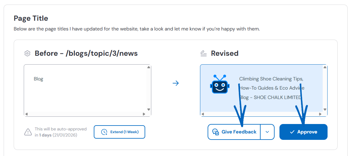 21. You’ll also see two buttons in the bottom right-hand corner. Click Give Feedback if you are not happy with the page titles and wish to amend them in some way, or click Approve. If you click Approve, copy the text to your Notepad file so you can amend the page titles based on the suggestions: