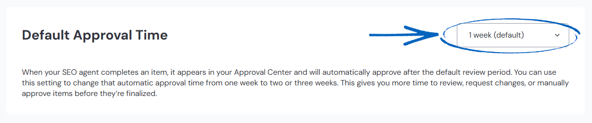 23. At the top of the page, you’ll see an element for your Default Approval Time with a drop-down menu, where you can amend the periods between suggestions being approved by you as opposed to automatically approved by Seb AI. The approval time setting controls how long new items stay available for review in your Approval Centre before they expire or automatically move forward. Use it to keep work flowing and avoid bottlenecks.