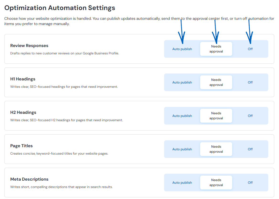 After the first month, you’ll regularly approve blog posts, website copy, and Google Business Profile updates, following the proven 4-week cycle.