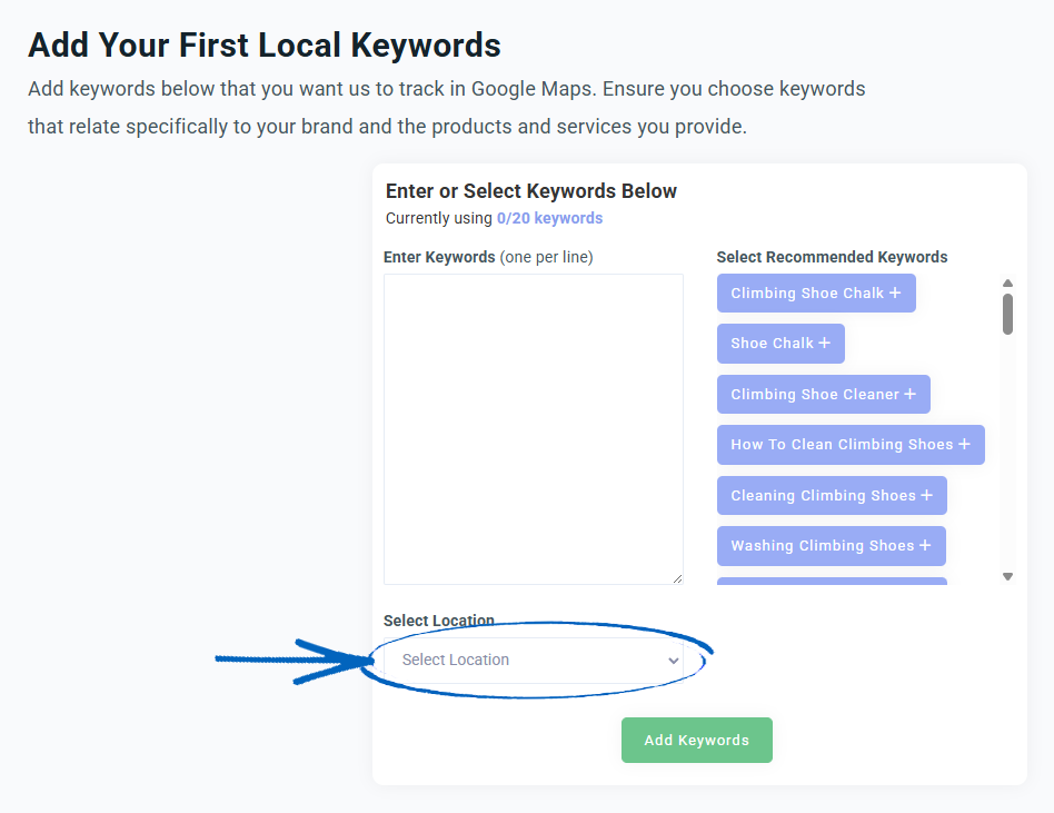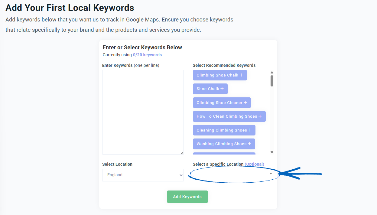 4. Then you need to add in Local keywords. You can do this by clicking the Recommended Keywords on the right-hand side, or by typing your keywords directly into the Enter Keywords field. When you have finished adding your keywords, click the green Add Keywords button: