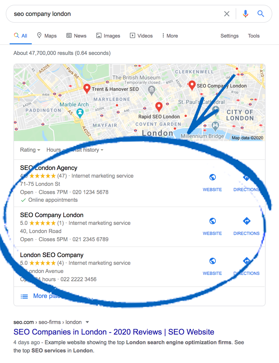 The Map Pack reflects the top three searches. For example, if you searched 'hair salon, London', the top three results shown are the Map Pack results. The Map Pack ranking results can vary from the Google Map rankings, which will show a selection of the closest results, whereas Map Pack will show the top three ranking results.