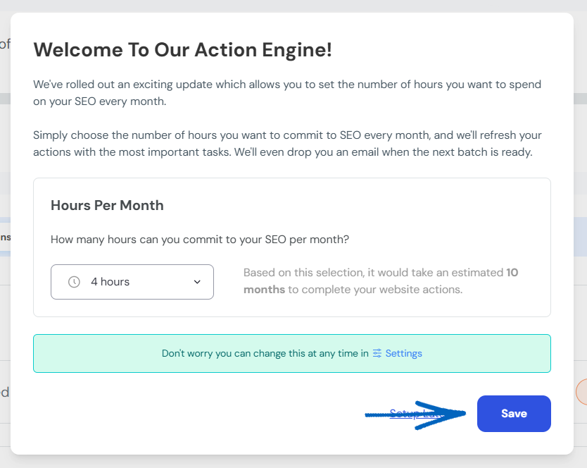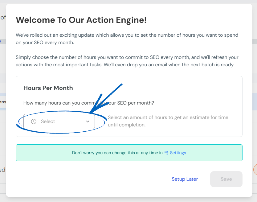 2. You’ll then see this modal. Use the drop-down options here to assign yourself a few hours that you can dedicate to working on the SEO of your EKM online shop each month: