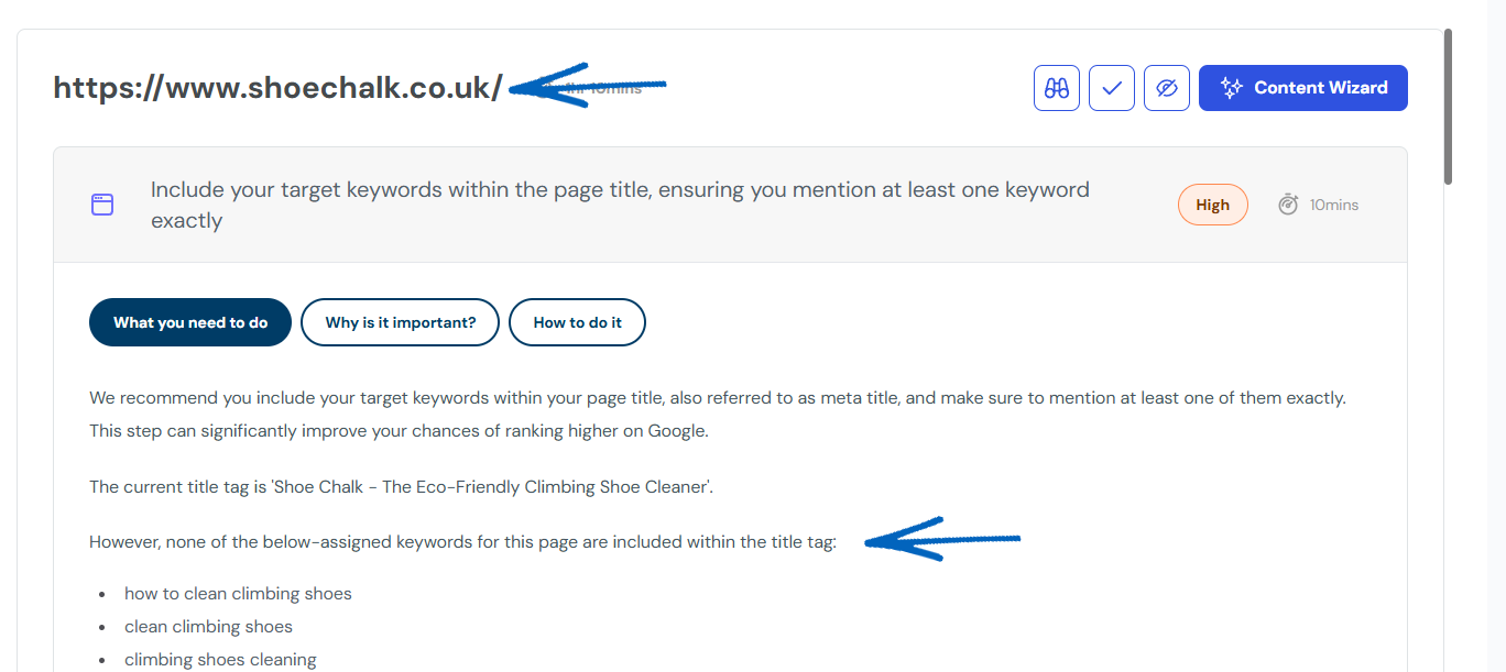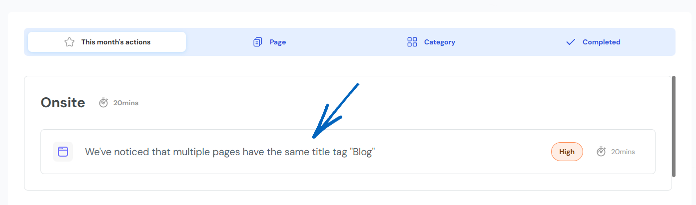 You may notice sometimes that the same action has a different priority score depending on which page it needs to be completed on. For example, sometimes you might see that the action ‘adding a h1 to the page’ will be a high priority for some pages, but medium for others. This is because the priority score we give an action to depends on whether the page is one you've added to your keyword sitemap. If you've assigned keywords to a page on your sitemap, then all the actions for that page get a higher priority. That will mean an action like ‘adding a h1 to the page’ will go from medium to high priority.