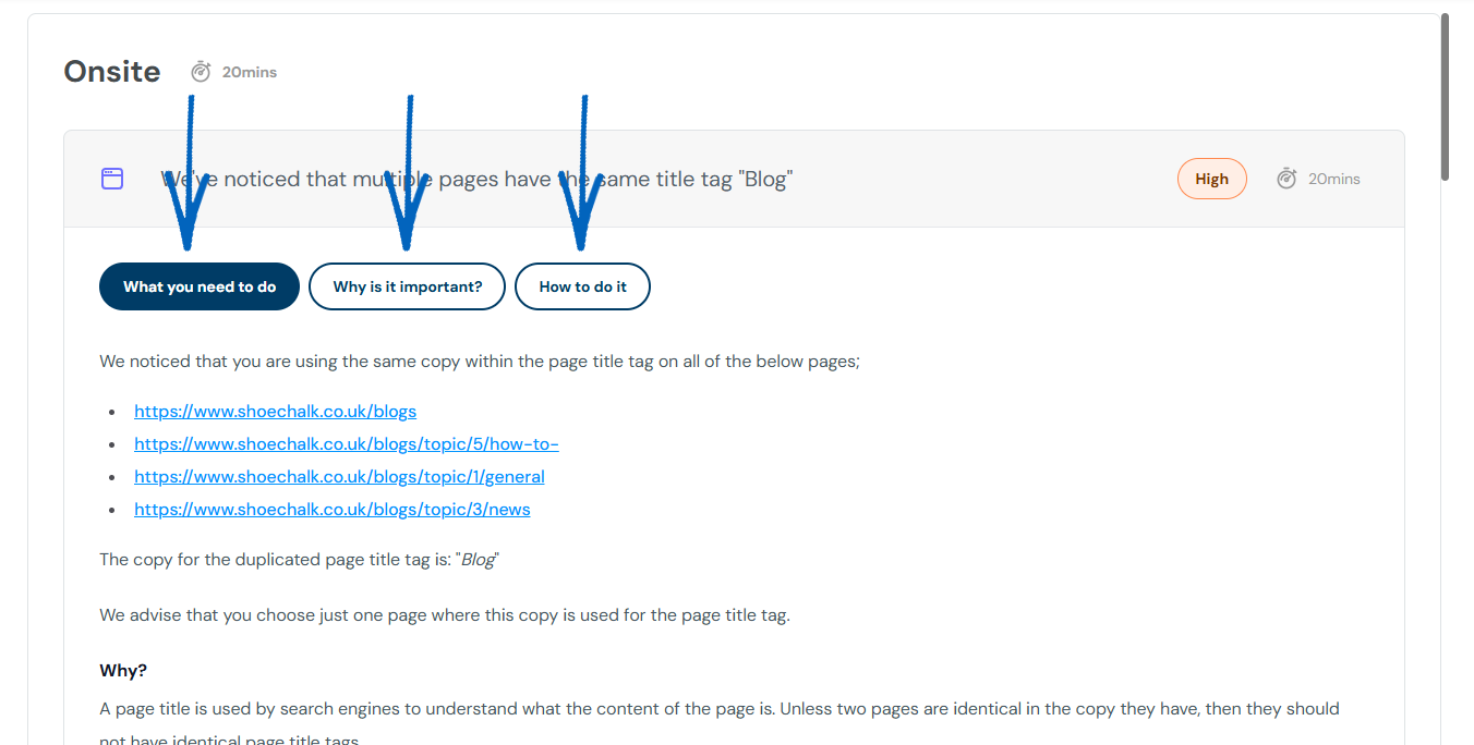 6. When you click a task, it will display more information about the task itself. In this case, SEO AI has identified that multiple pages on this EKM online shop have the same title tag. You can click each of the buttons at the top of the summary to reveal more information about this issue and why it is important that it is resolved: