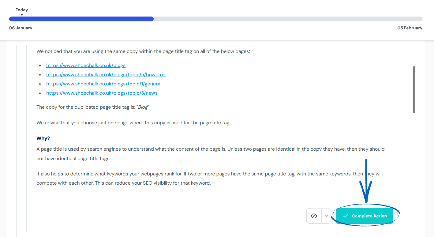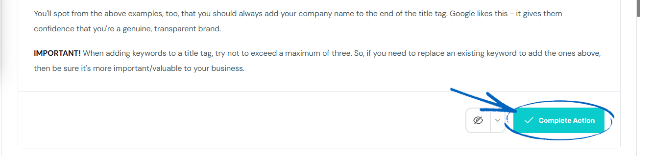 13. Returning to the browser tab displaying EKM SEO, you then just need to click the Complete Action button for that task: