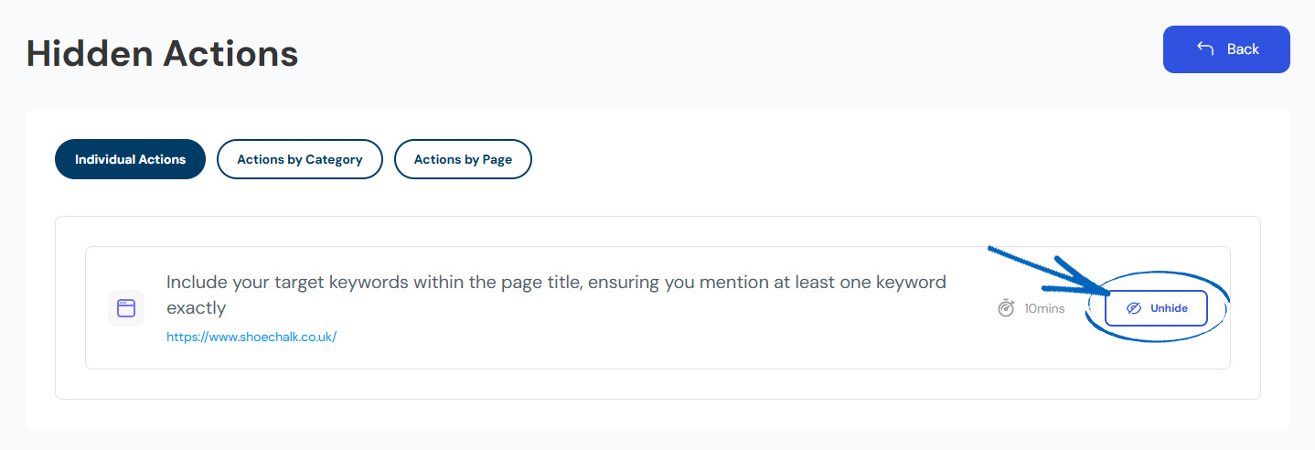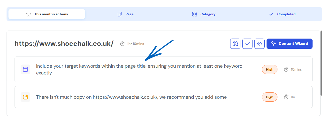 Page - This means you will see a URL for a specific page, with the actions that need to be completed underneath. When viewing by Page, you won't see all the Actions you have on the platform. You'll see a condensed amount, as before. These actions should take you as many hours to complete as you've said you can commit to SEO per month.
