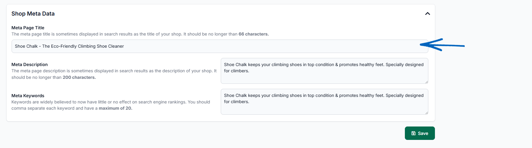 11. As the URL for this task is the homepage of this EKM online shop, we need to log into that EKM online shop on a separate browser tab, navigate to Settings > Shop Details, and then scroll to the very bottom of that page to see the Shop Meta Data, and specifically, the Meta Page Title field: