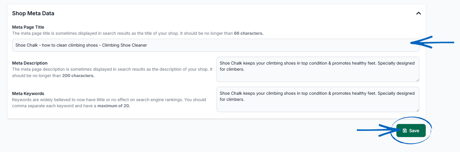 12. Looking at the text in the Meta Page Title field, we need to amend that to include one of the keywords generated by Seb AI. When we have added our keyword, we click to Save our changes: