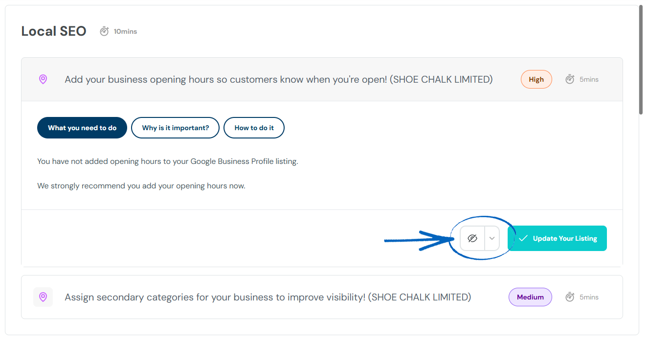 Sometimes, you may want to hide tasks on the list. For example, you might have completed the task, but as your EKM online shop hasn’t been crawled since the changes were made, the action is still visible. Alternatively, you may not have been able to add all the keywords into an area successfully – like in the case of the Meta Page Title field of your EKM online shop which only allows 66 characters or less where it would be impossible to add all recommended keywords to this area. After you have added your keywords, it would then be beneficial to hide this action.