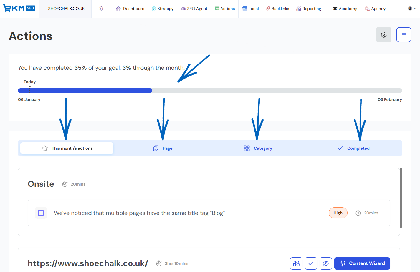 During the onboarding process, you will determine an amount of time each month that you will allocate to working on the SEO for your EKM online shop. The Your Actions page lists all of the tasks you need to complete within that given time period. You can adjust this time period to increase or decrease the amount of time later in this guide.