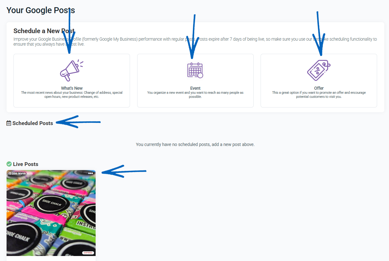 2. You’ll then see this page. A summary of posts that are currently live on your Google Business Profile will be displayed at the bottom of the page. Above that will be any scheduled posts, and the three buttons above this will take you through the process of creating one of the three different kinds of posts: