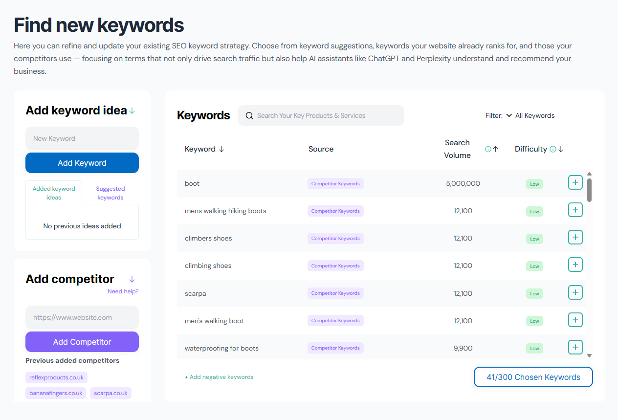Here you can refine and update your existing SEO keyword strategy. Choose from keyword suggestions, keywords your EKM online shop already ranks for, and those your competitors use - focusing on terms that not only drive search traffic, but also help AI assistants like ChatGPT and Perplexity understand your business and recommend it.