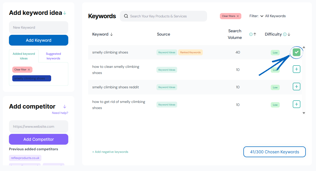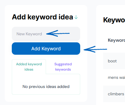 1. On the left-hand side of the page, you’ll see the Add Keyword Idea element. Here, you can add new keywords to the field provided before clicking the Add Keyword button: