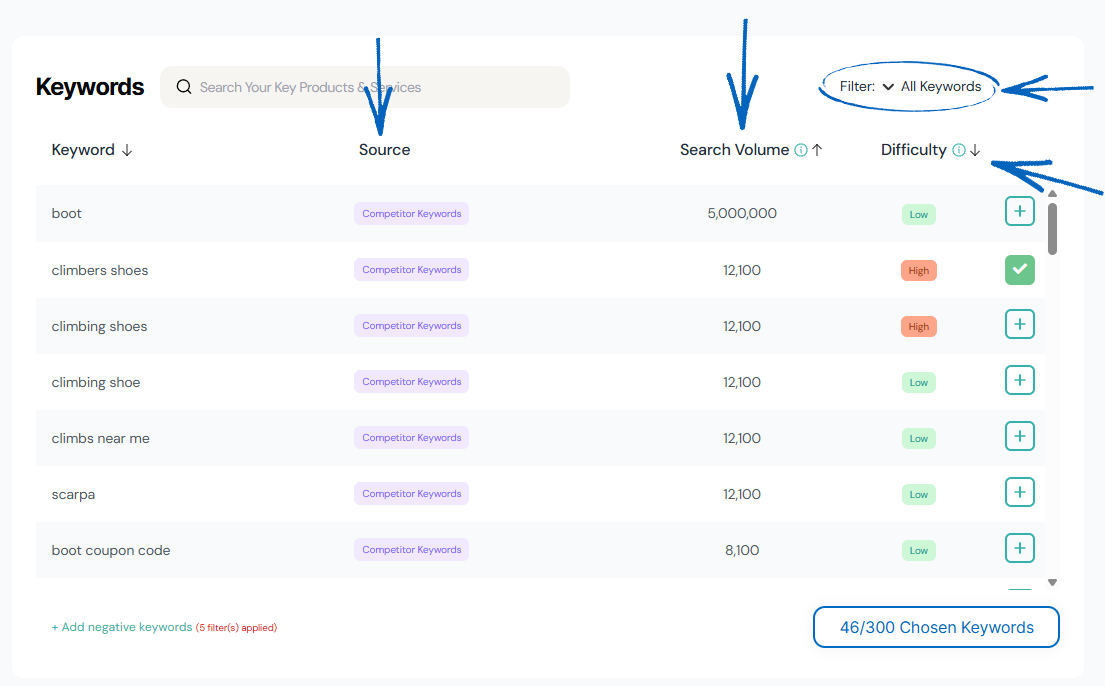 1. To add negative keywords to your strategy, first review some of the keyword suggestions in the list. Scroll down and take note of some of the keywords that include the same individual words. In this example, ‘boot’ appears often, but this keyword is not related to the products on this EKM online shop: