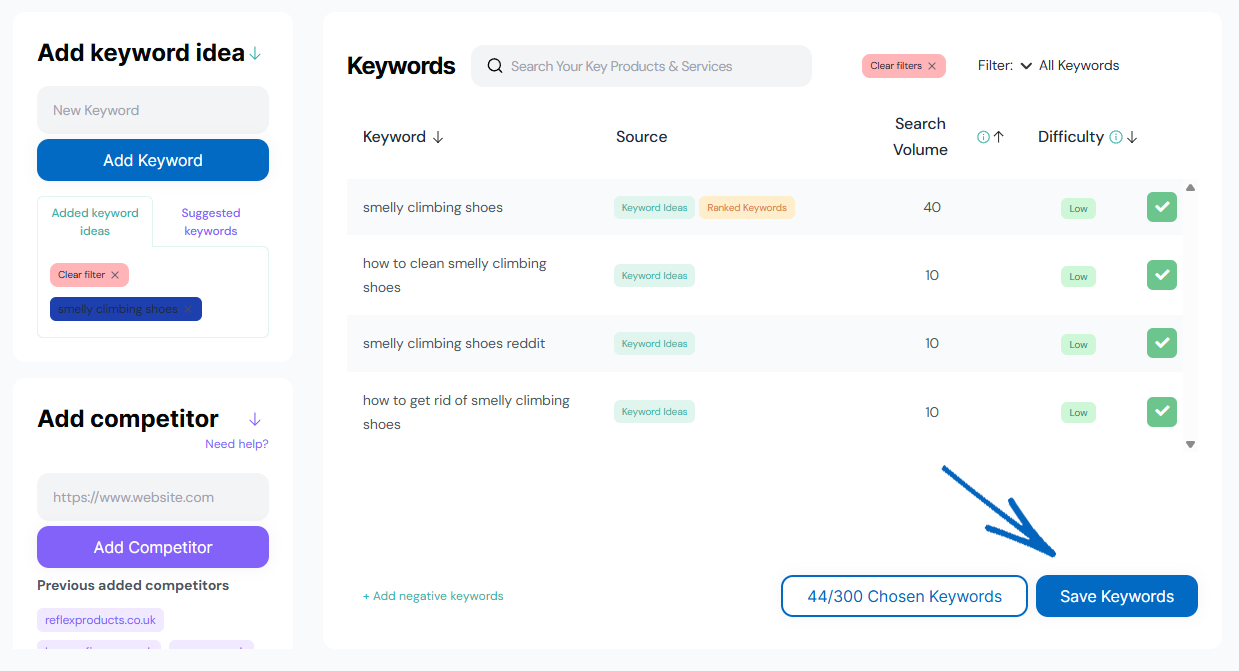 2. You can add up to five competitors here and, as a result, will be able to see the keywords they use on their own websites. You can then filter through those keywords and select the most applicable to your EKM online shop to use in your own SEO strategy.