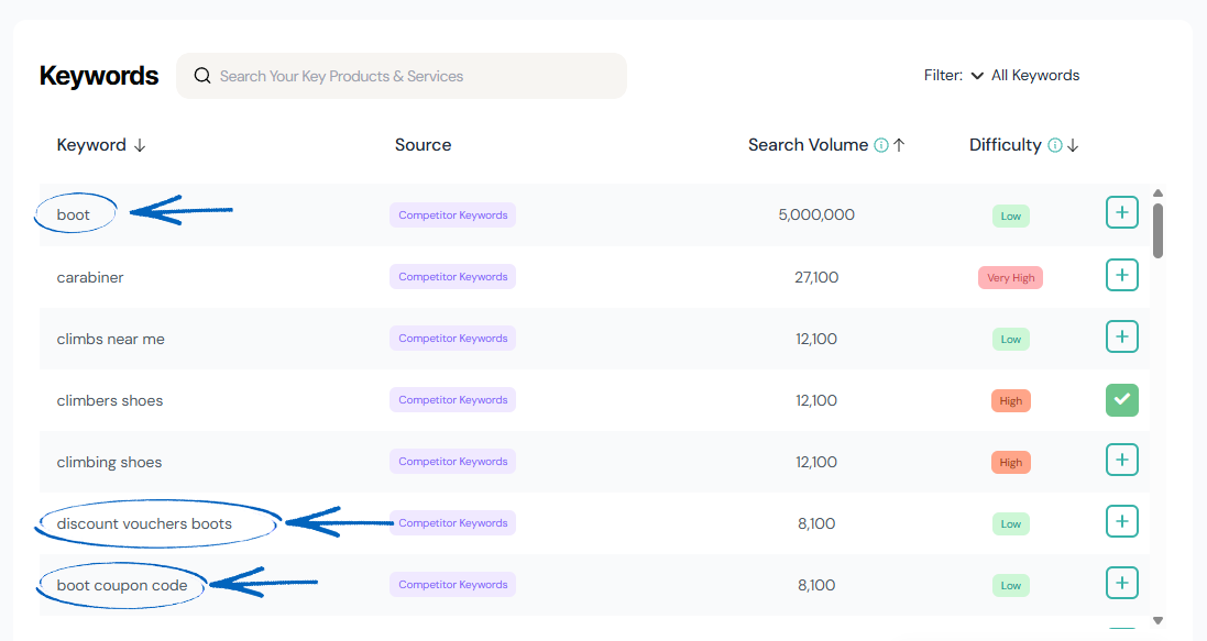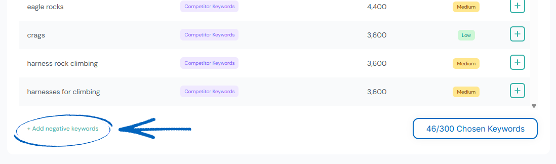 3. To add a keyword, click the green plus symbol on the far right-hand side:
