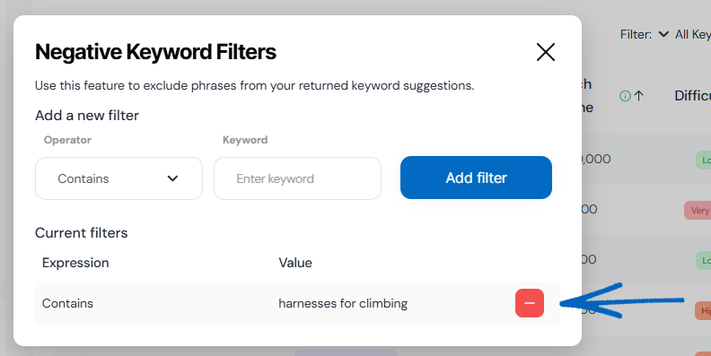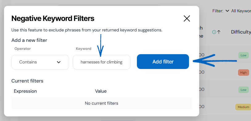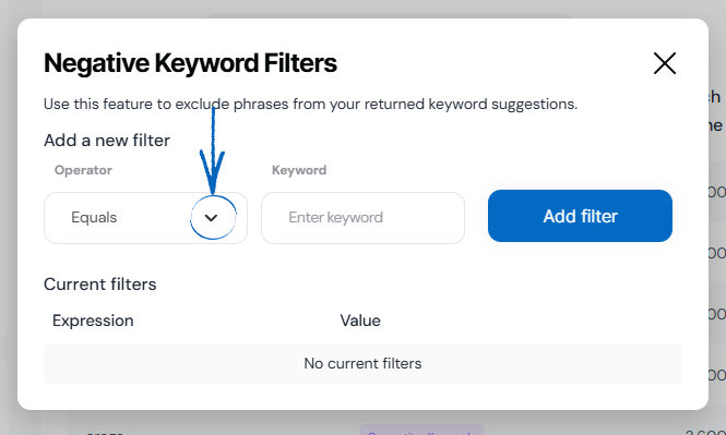 4. When you have selected the right operator, add the keyword into the field provided and click the blue Add Filter button: