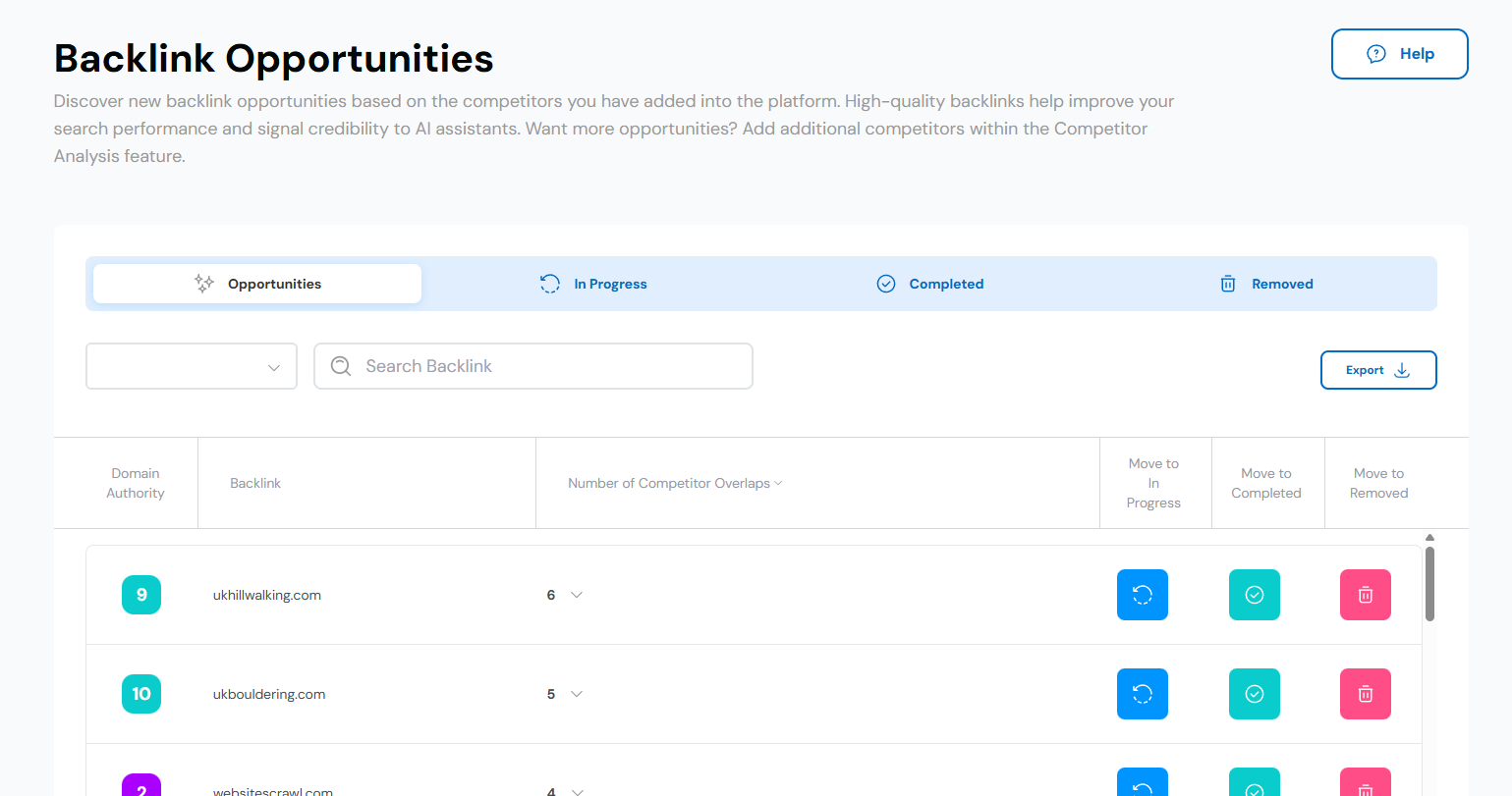12. When you have received responses from your outreach emails, you can then return to the Backlink Opportunities page and sort the backlinks into relevant tabs. For positive responses, click the Move To Completed button for the backlink URL. For negative responses, you can click Move To Remove. However, if there’s no response after 28 days, perhaps click Move To Opportunities to remind yourself to revisit that backlink website at some point later in the future: