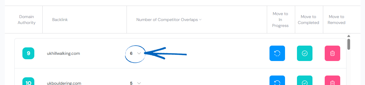 4. Looking at the table below this, you’ll notice that each referring domain is listed with its domain authority score, and after this, you’ll see the Number of Competitor Overlaps. Click the down arrow symbol next to the number: