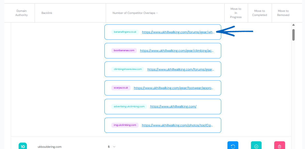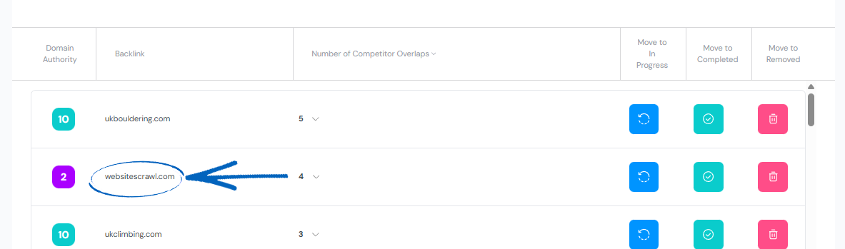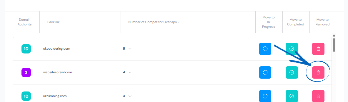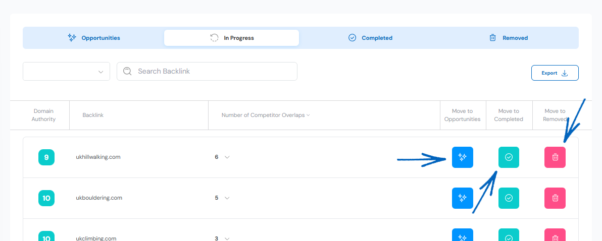 Here you’ll see of all your chosen backlinks. On the right-hand side there are three buttons to move the backlink to a different tab if necessary: