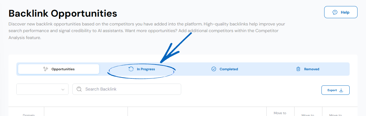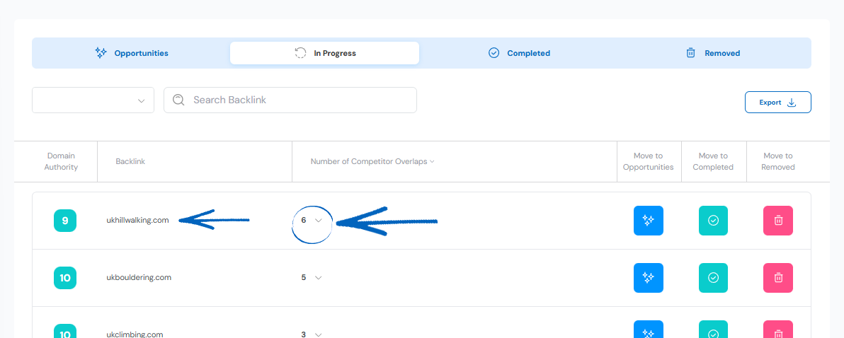 6. If you would also like to get a backlink on that domain like your competitors have, your first step is to click the blue button on the top right-hand side, which will move this domain onto the In Progress tab: